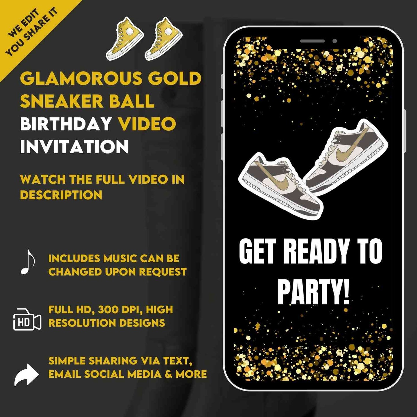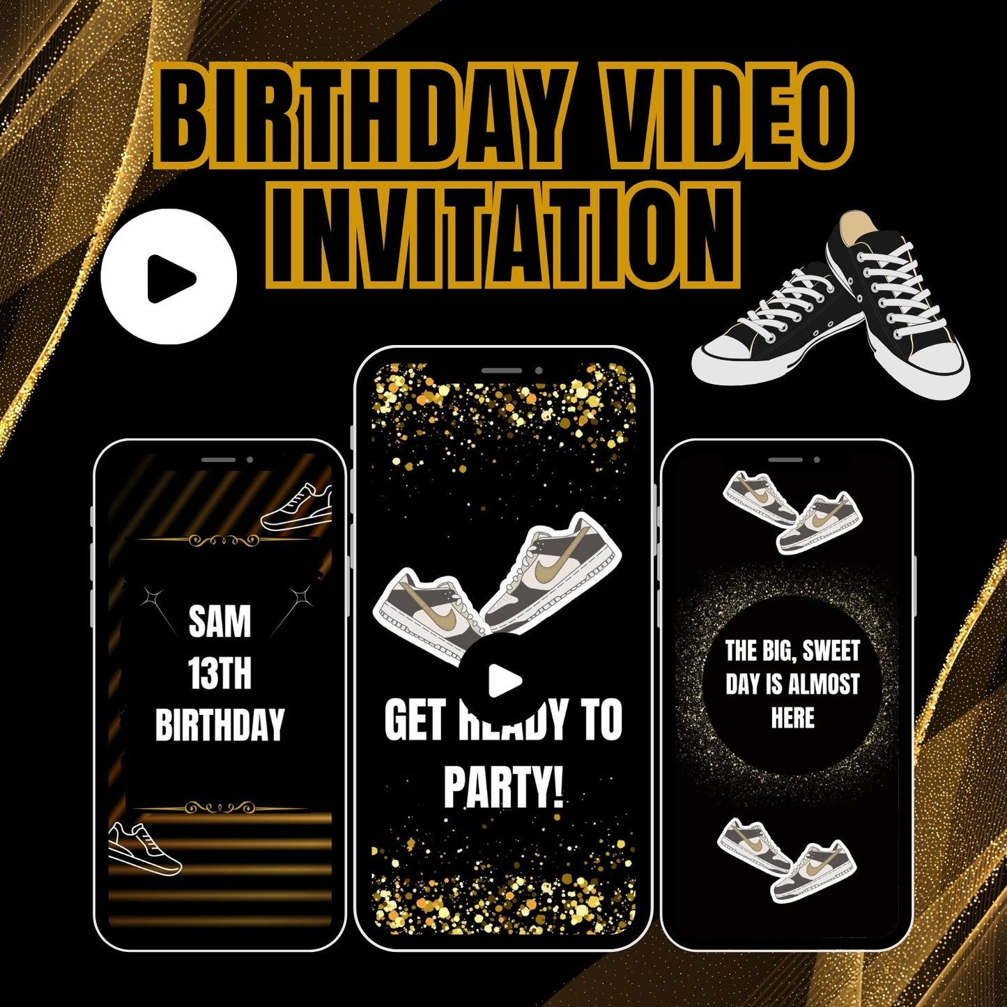 Glamorous Gold Sneaker Ball Birthday Video Invitation | Trendy & Unique