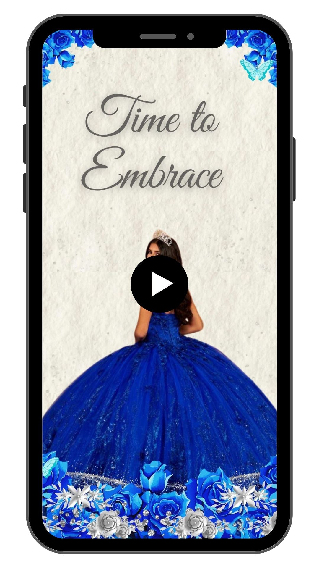 Imagine the excitement and admiration your guests will feel when they receive an exquisitely animated invitation that reflects the grandeur and elegance of your Quinceañera. The royal blue and gold theme will make them feel honored and eager to attend.