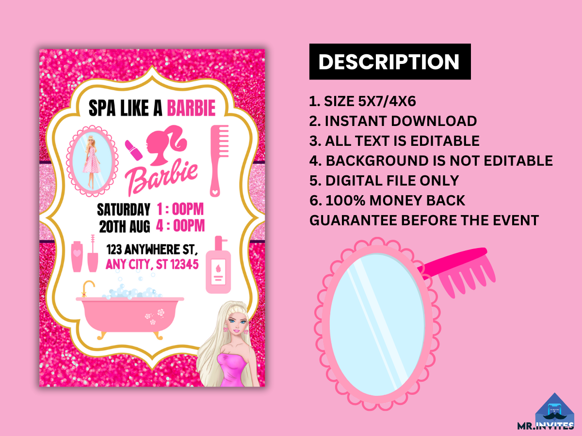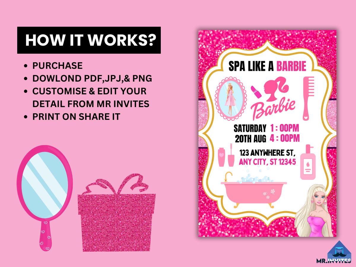 Elevate your celebration with our Sparkling Barbie Spa Digital Birthday Card Invitation!